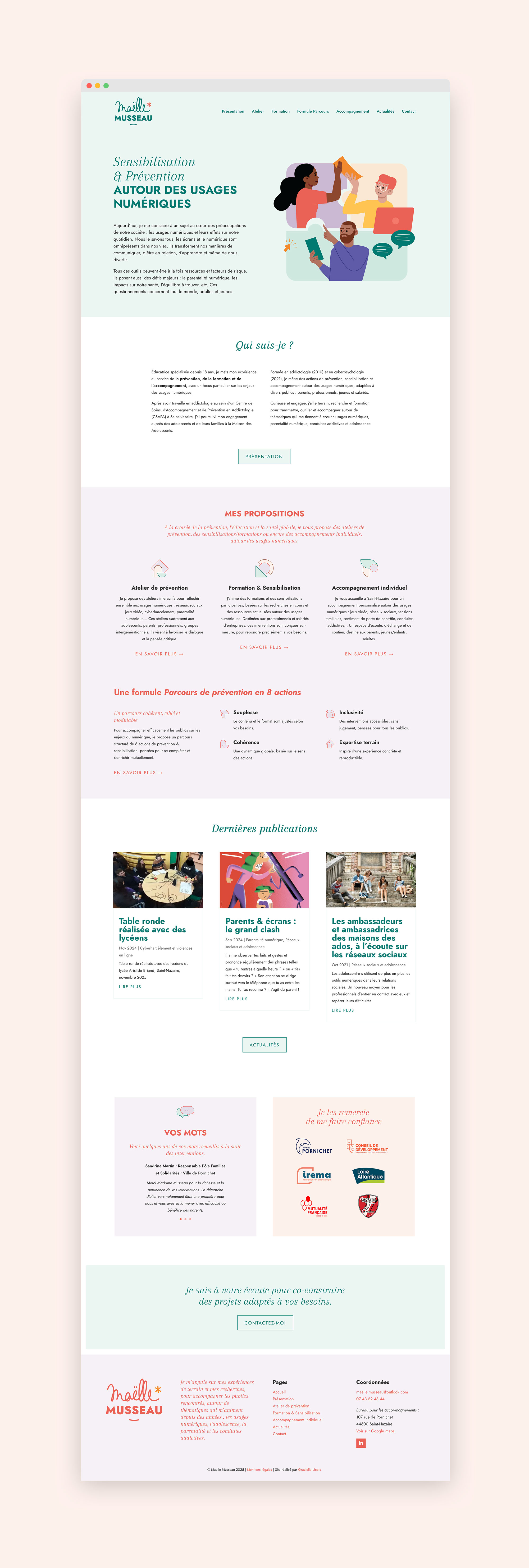 Je l’ai accompagnée lors du lancement de son activité en indépendante, j’ai créé un logo signature, une identité visuelle qui met en valeur son expertise ainsi que sa bienveillance et un site internet clair adapté à son audience.